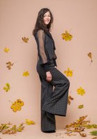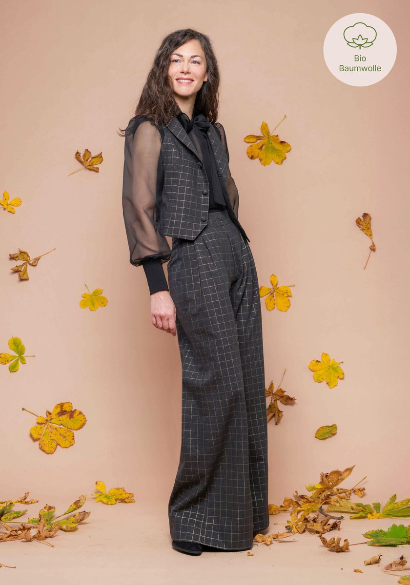Die Weste und Hose aus 98% Bio-Baumwolle mit feinem, dezent schimmerndem Lurex-Grid formen eine lange, klare Silhouette. Der Body Odessa setzt mit transparenten Organza-Ärmeln, feinem Schlitz und eleganter Schleife feminine Akzente. Der weiche Bio-Baumwolljersey sorgt für eine schöne Passform und hohen Tragekomfort.