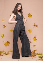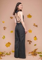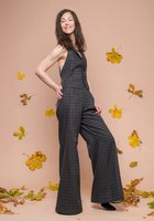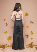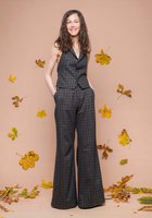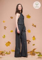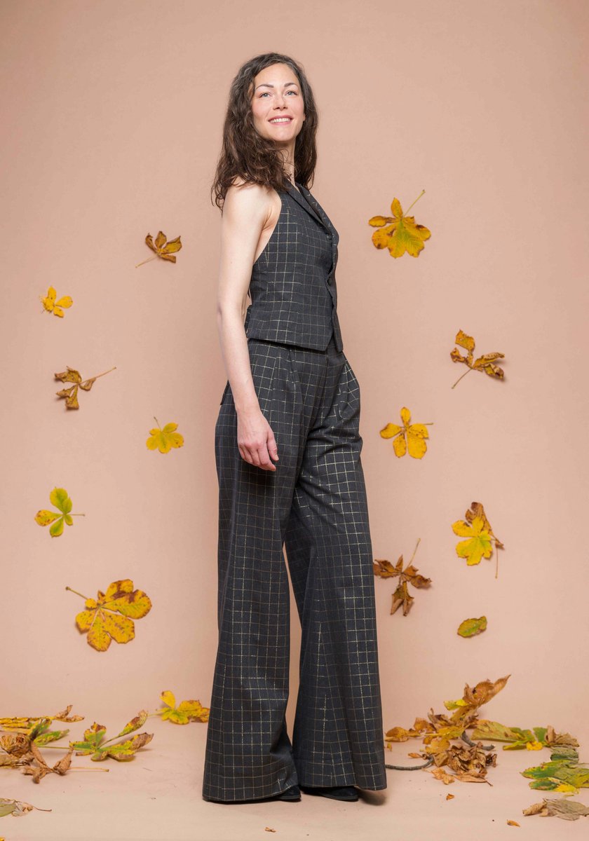 Die Weste betont die Taille und wird im Rücken individuell geschnürt, während die weit fallende Palazzo-Hose eine lange, schmeichelnde Silhouette schafft. Das schimmernde Karomuster verbindet Nachhaltigkeit mit modernem Statement-Style.